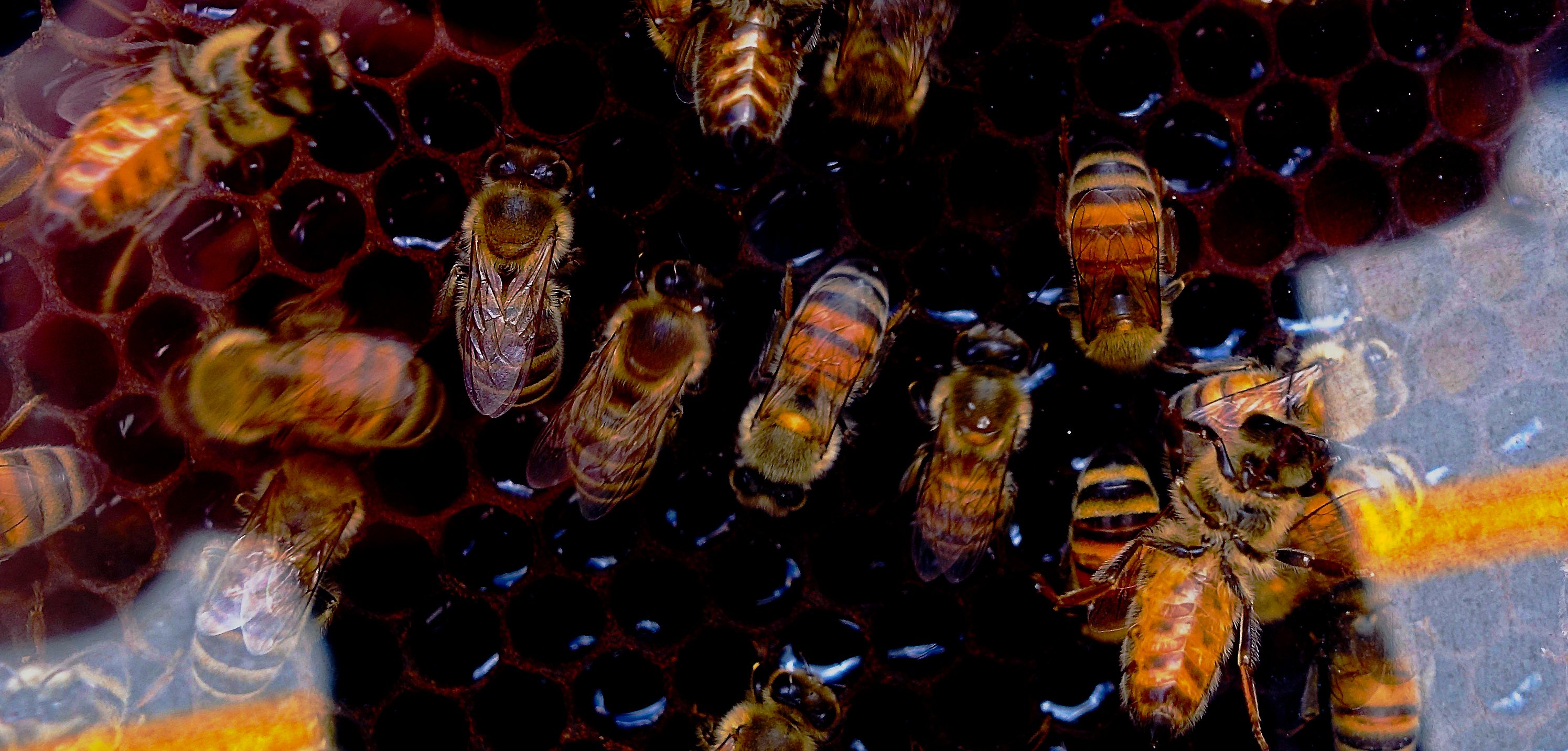 This is a shot of a beehive taken through glass. You can see my reflection, in a black t shirt, behind the bees. Once in a while you get a shot that you love so much, you keep looking at it. There are so many things I like about this: the detail with the bees’ bodies; the different focal points; the reflection (always a favorite shot for me); and even the colors.