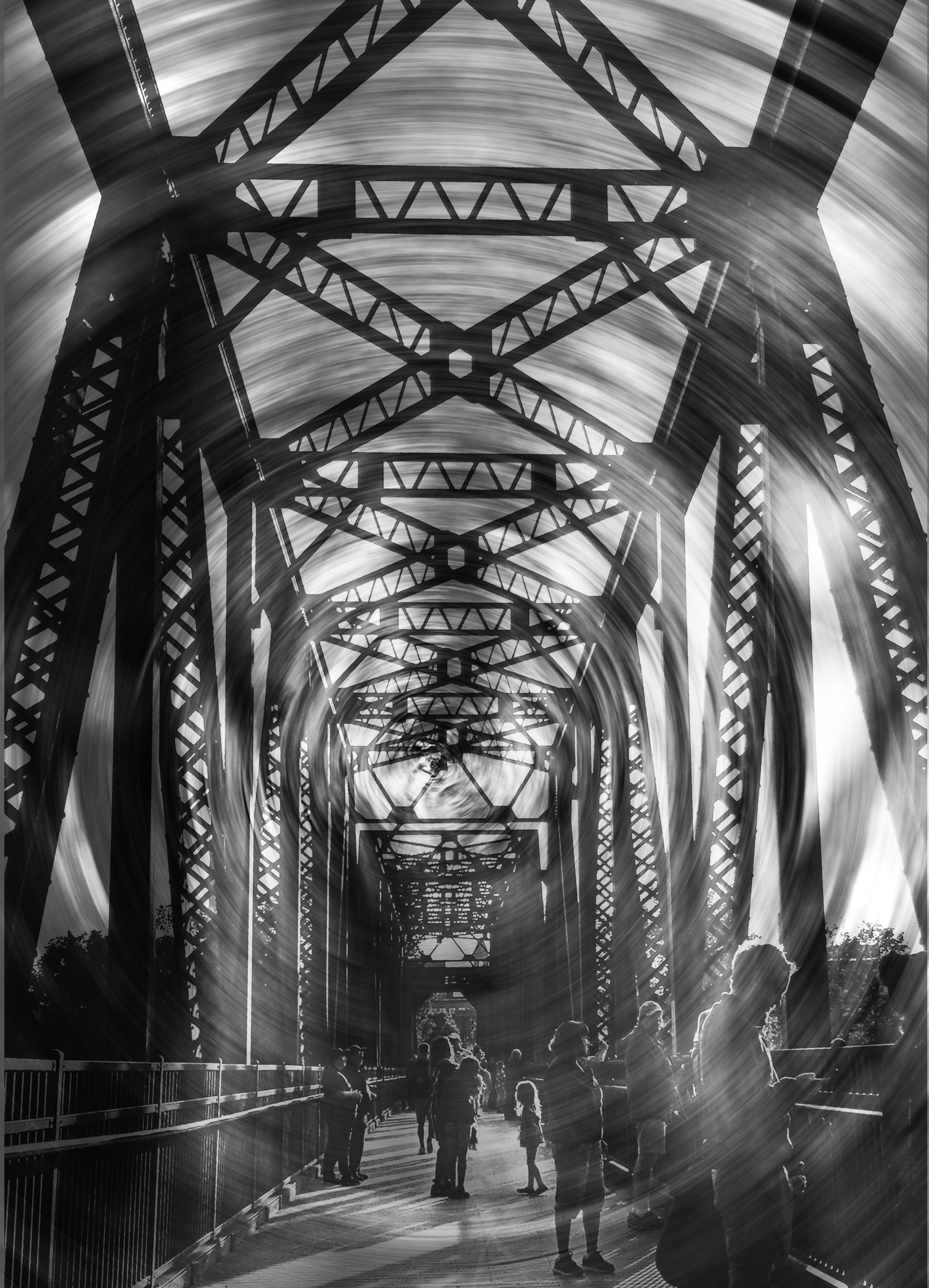 I attended a hot air balloon festival recently in Auburn, Maine. The best view was from this suspension bridge over the Androscoggin River. I like the shots I got of the bridge, but I can’t just leave it at that. I took a photo of a dead tree, used Photoshop’s radial blur, and blended that layer with the bridge.