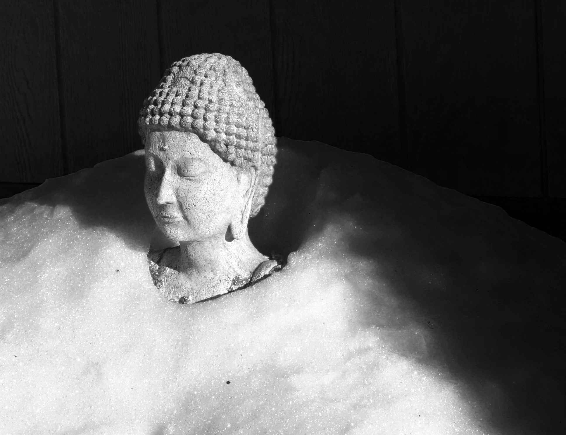 This image is from Liminal. We had our once-annual snowstorm here (Asheville, NC) in December, and my yard buddha statue was up to its neck in snow. (It is about 36 inches high which gives you an idea how much this storm produced.)