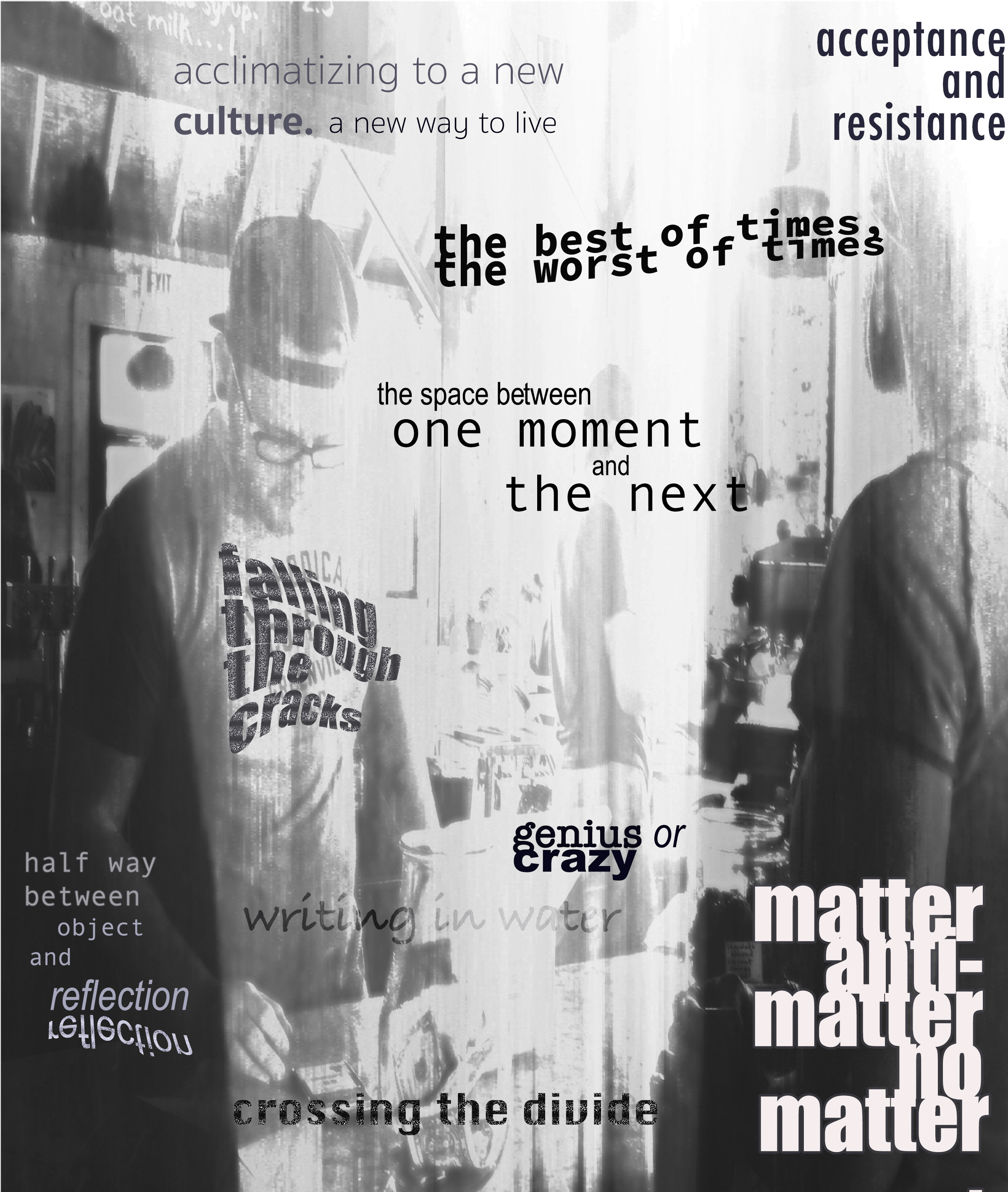 This is a page that didn’t make it into Liminal, although it defines the concept of the book. these are some of the transitional states that I explore, themes of not being quite one thing or another. And also, the page gave me a chance to play with typography, which is one of my favorite ways to spend time. I can take one phrase, a word even, and get lost for hours framing it in different ways, designing it in such a way that it conveys meaning or evokes some particular feeling.