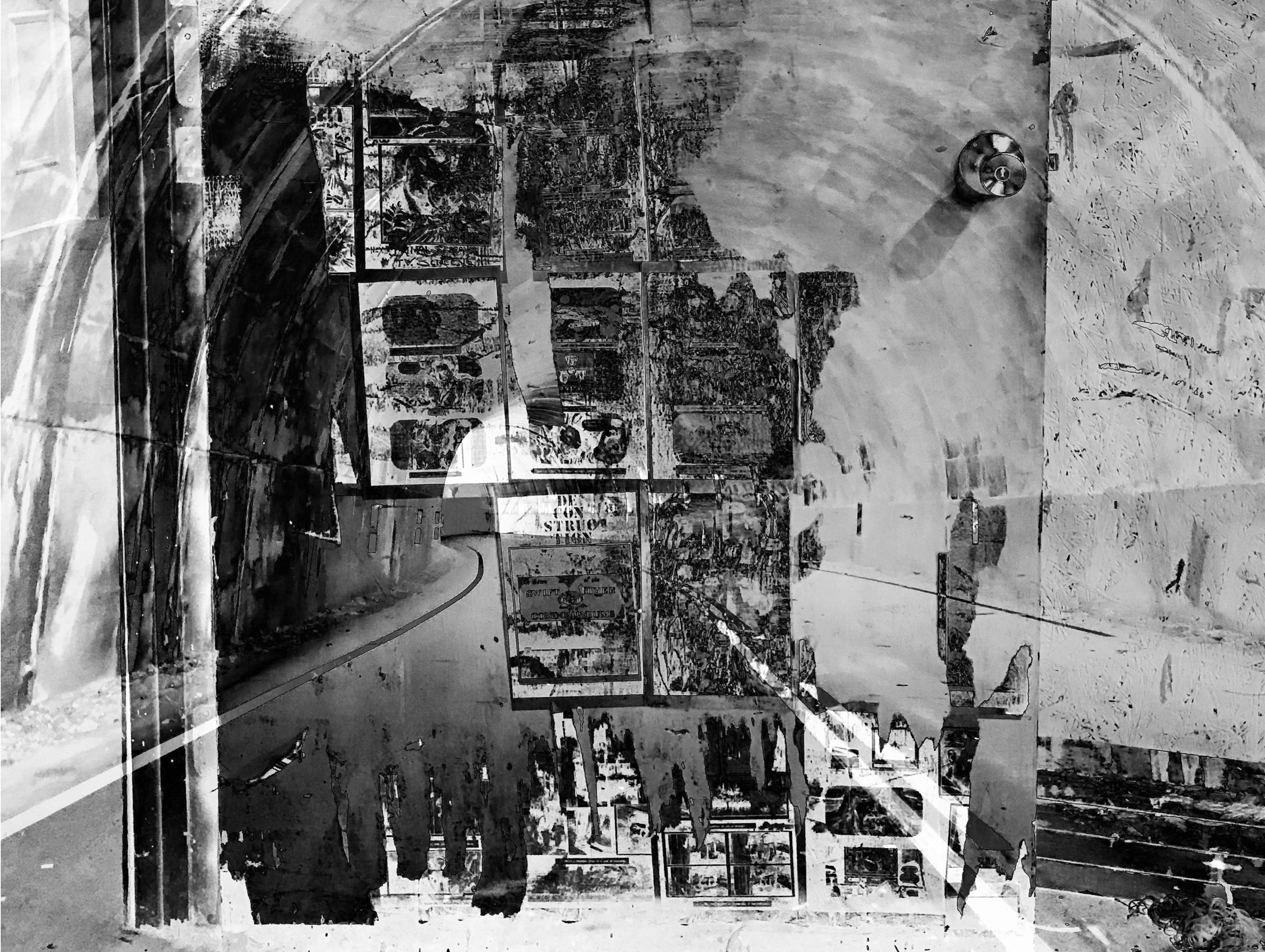 This is one of my favorite images from Liminal (see previous post for announcement and link). The original inspiration was the door of a painter’s studio in the River Arts District, which was layered with paint, comics, playing cards, and general wear. There is something about texture that is just fascinating to me. I took a picture of the door, and layered it with a picture of another favorite subject, a tunnel. (This was one of the tunnels on the Blue Ridge Parkway, that goes under a part of the mountain. When the Parkway closed because of a storm, I hiked up and took pictures.)