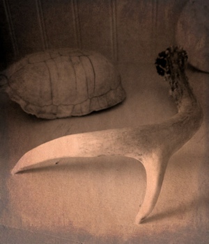 When you live with someone as sharp-eyed as my husband, you end up with objects like these around your house. (Along with an enormous number of 4-leafed clovers.). On a bike ride through the woods, he spotted a deer antler off under a tree. Last summer, we were wading through a swamp and he found this turtle shell. I don’t have much use for knick-knacks, but these suit me just fine.