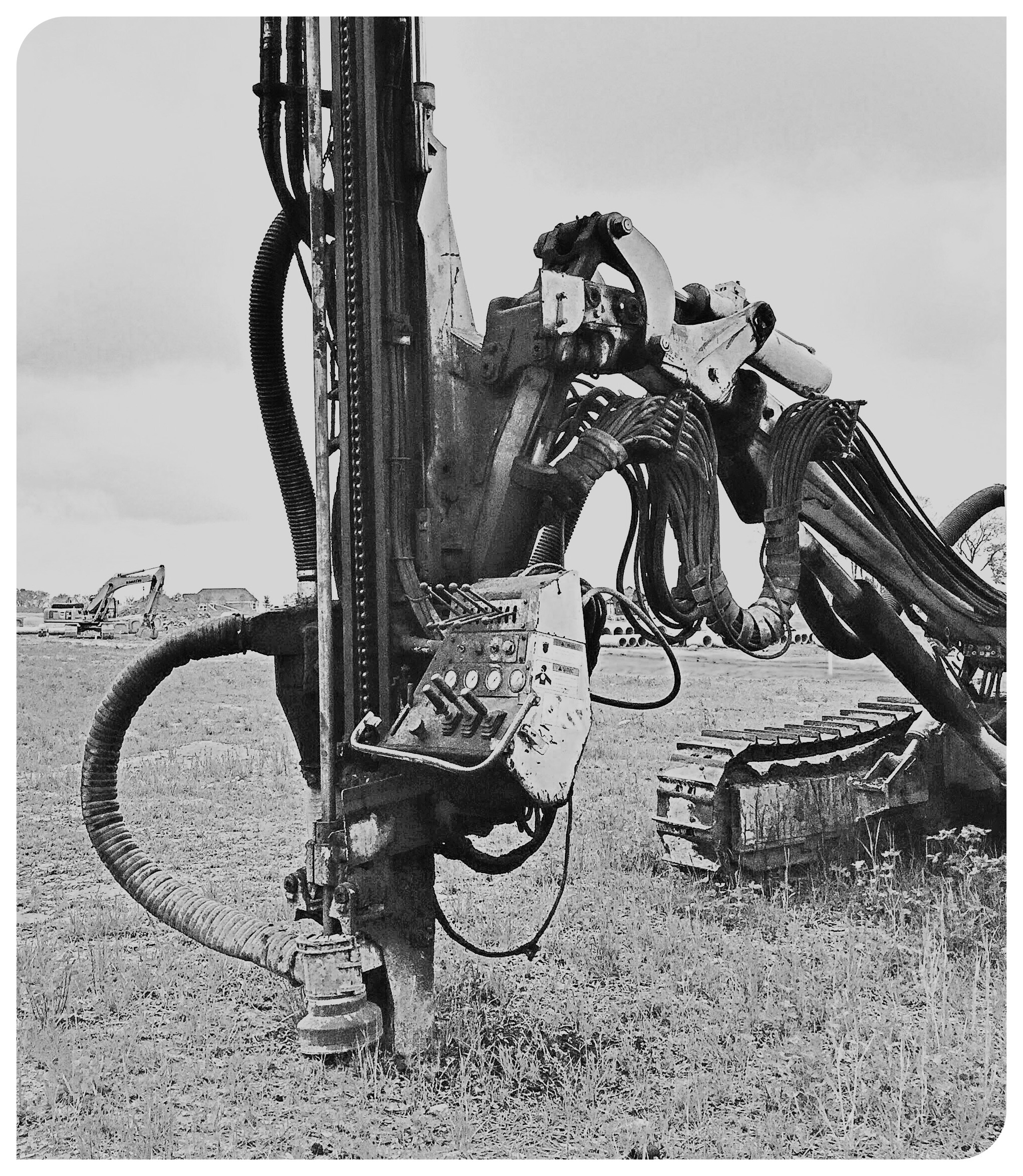 This arcane device, that looks like a piece of farming equipment, perhaps a remote control for a tractor, from the science-fiction decade of the 60s. Actually it’s contemporary, and this actual piece is in use currently in a part of my neighborhood being developed. It’s used to drill a hole in the ground, into which some dynamite is dropped. Then everyone runs like hell, jumps behind a dump truck in the nick of time, and dirt and rocks spray up into the air for 500 feet in all directions. I actually don’t know what happens, but I do know that this is what they use to drill down, and there is an air horn on top that lets out a pitiful little bleep, which I can sometimes hear from my house, and then muffled [boom]. I think the explosion is under ground, maybe it pulverizes the rock. But who cares. I like machines of all kinds, the more complicated the better.