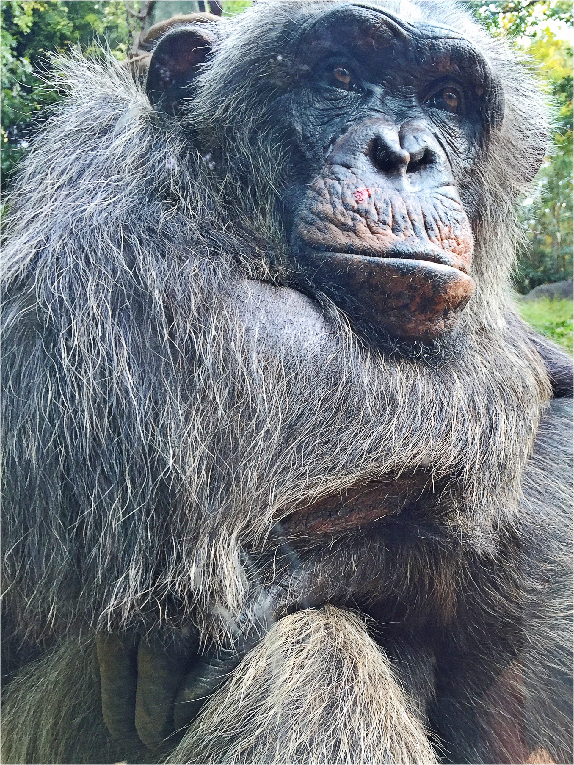 Chimps are very close to being human, DNA-wise. If you spend time gazing at one of these creatures, they seem more and more human; what you are looking at is a reflection of yourself.