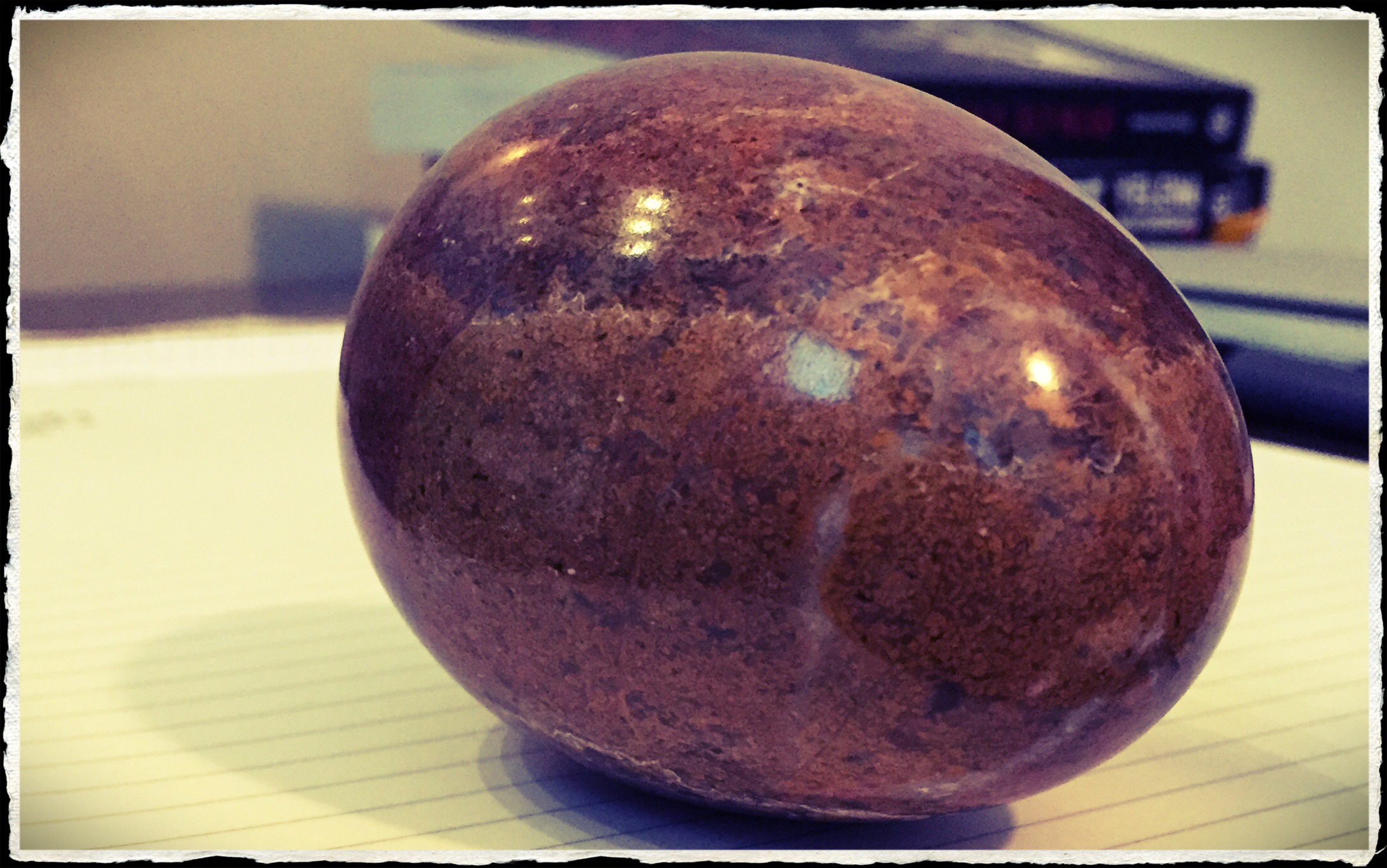 An onyx egg, from the gift shop at the North Carolina Zoo. As zoos go, it’s a pretty good one, the animals are well treated with big enclosures, lots of qualified keepers, proper care. I really didn’t go there to shop, but these big hunks of marble felt so good in my hand that I had to pick one up. It felt like having a miniature desert in my palm.