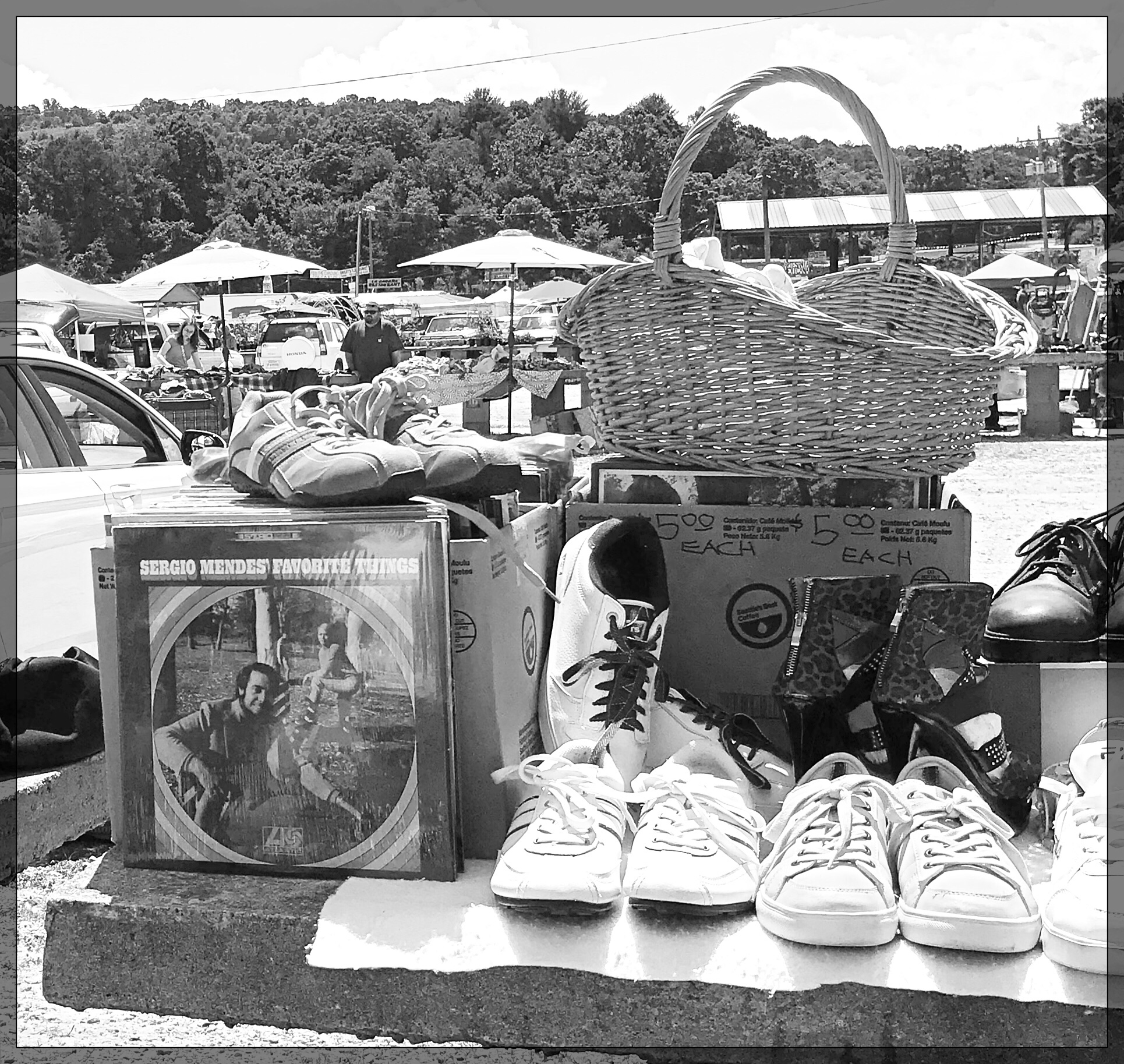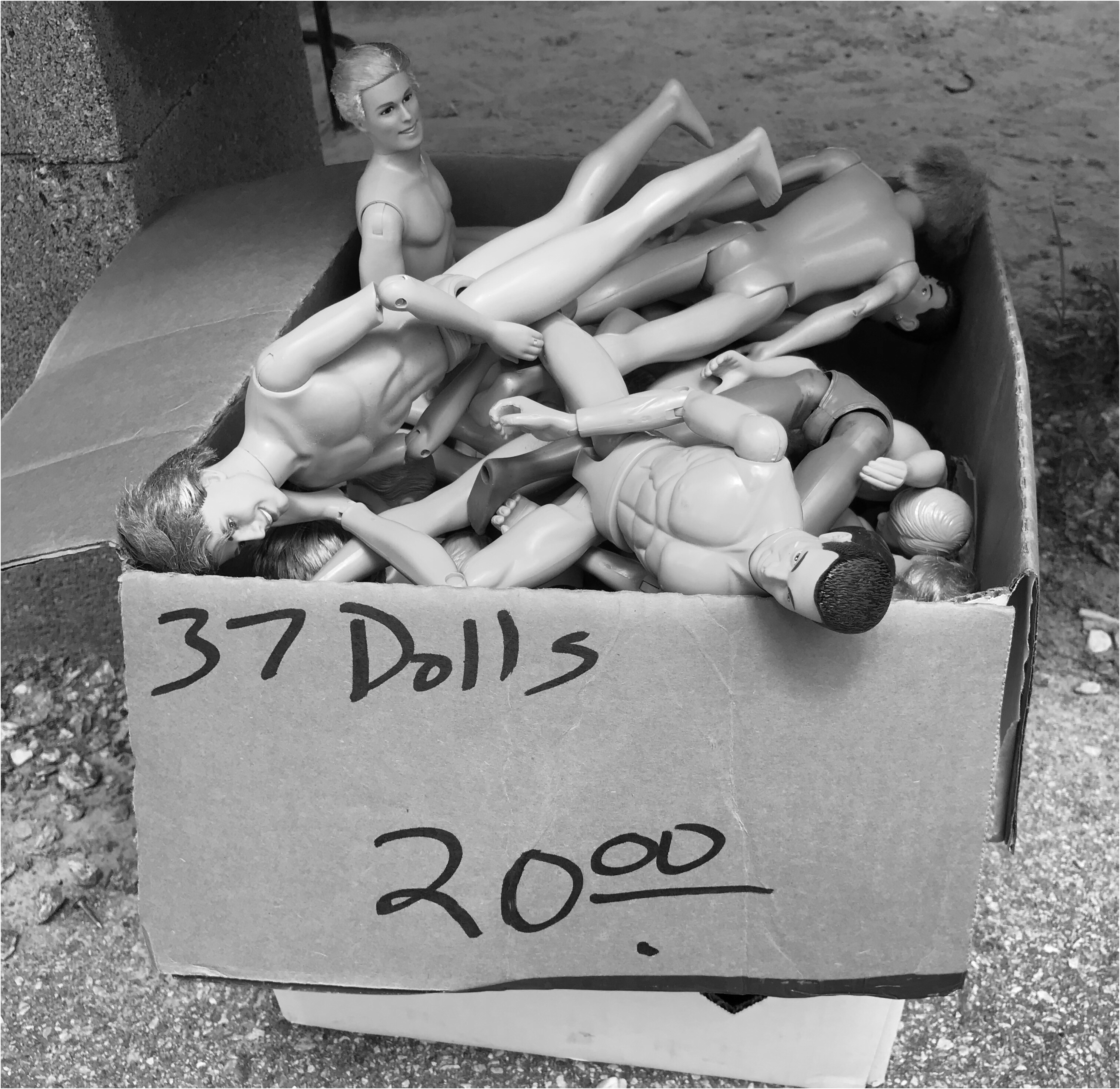 I generally like flea markets, shlepping around under hot sun, meeting the vendors, trading stories with them about their treasures … recently went to the Saturday Smiley’s Flea in Fletcher, NC. I must say, I didn’t have the same experience there. It just made me deeply sad. People (trying to) sell crates of past-date personal care products that had been baking in the sun for hours … tables piled up with old shoes … moldy CDs and VCR moves. Cases and cases of moldy rotten clothes. However, I did find things worth taking pictures of. The box of dolls was a once in a lifetime shot, but the rest – just sad. OVERHEARD: “My grandpa could chew steak – without any teeth at all!” Said with great pride.
